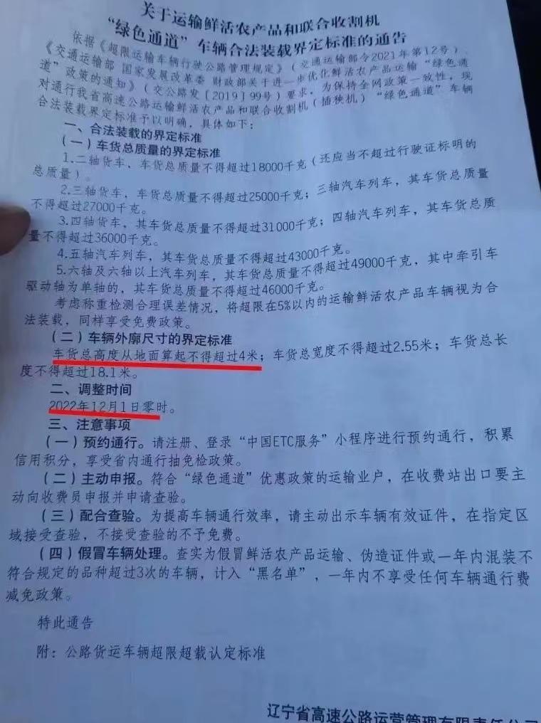 遼寧省高速公路運營管理有限責任公司于2022年12月1日實施的《關(guān)于運輸鮮活農(nóng)產(chǎn)品和聯(lián)合收割機“綠色通道”車輛合法裝載界定標準的通告》。受訪者供圖